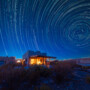 Star trails over a desert cabin.